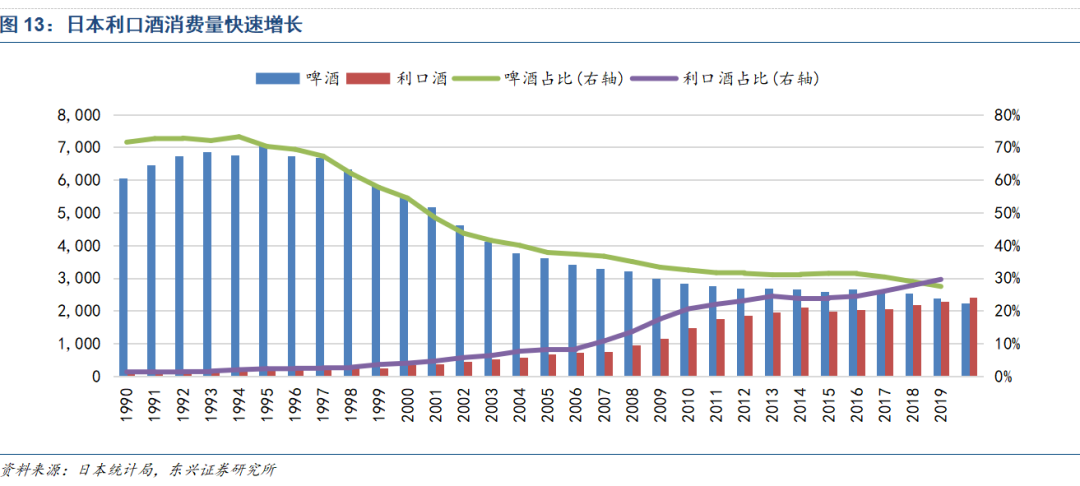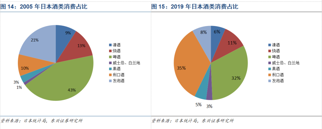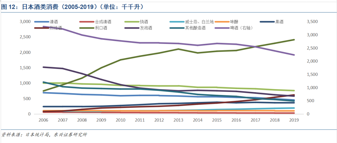 存量博弈阶段(21世纪至今):2000年后由于日本经济一直萎靡,日本酒类消费量不断下滑,酒类总消费量从2000年的952万千升逐年下降到2019年的813万千升,清酒、烧酒、啤酒等品类都进入下滑阶段,但是味道多样化的利口酒受到年轻一代和女性消费者青睐,实现逆势高增长。
