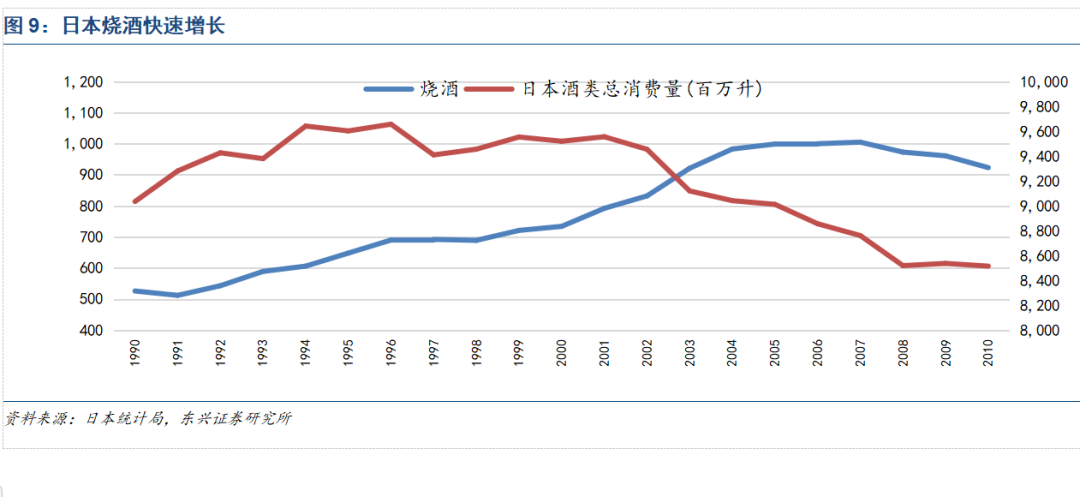 同样是价格敏感的90年代,日本烧酒的消费量逆势爬升。从1990年代初到2007年,在日本酒水消费量总体下滑的背景下,日本烧酒消费量却实现了翻倍增长,带动烈酒消费份额提升。我们认为,其原因主要在于:(一)日本经济长期停滞、人口结构老龄化带来巨大的社会压力,下班后的聚饮和独自买醉都非常普遍,度数较高的烧酒更能满足这种需求;(二)烧酒作为本土蒸馏酒,相比于清酒和其他烈酒价格较低,符合追求性价比的消费倾向;(三)烧酒饮用时可向酒中加冰或、苏打水和茶等其他饮料,在不同年龄层和性别的人群中都有较高的接受度。