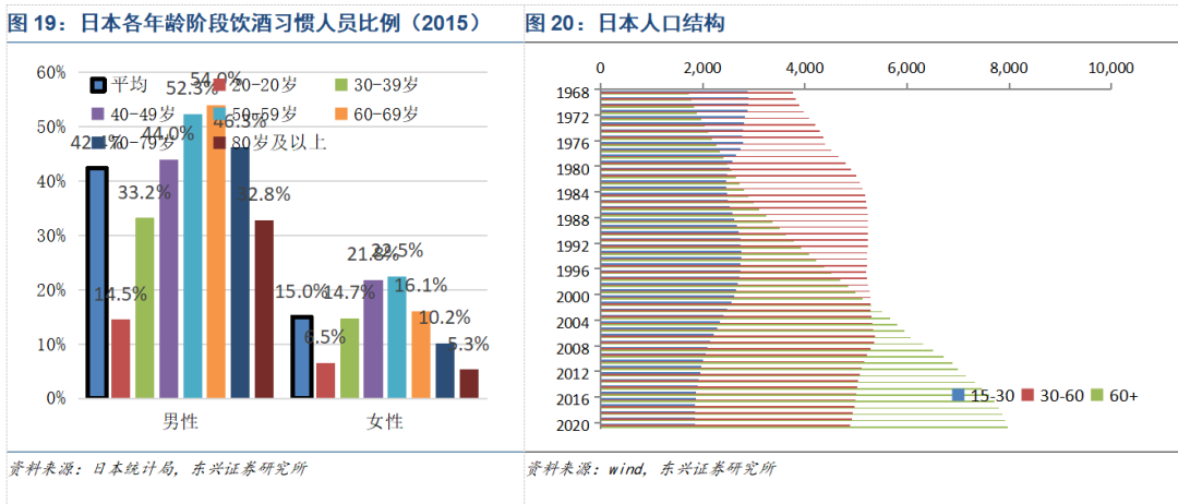 从日本各年龄阶段饮酒的比例来看,男性饮酒主要集中在40-79岁年龄区间(饮酒比例超过平均数)。女性饮酒则是集中在30-59岁,饮酒的年龄区间较宽。日本人口老龄化后,日本酒水发展呈现两极化,一方面是年轻人对各种口味的猎奇需求,另一方面是老龄人口对烧酒等烈酒的需求。