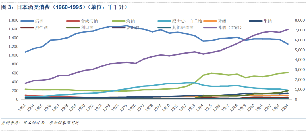 快速放量阶段(1960年代至90年代中期):这一阶段是日本酒类消费的黄金时期,酒类消费量快速放量增长,从1960年的207万千升提升至1994年的964万千升,消费量增长接近4倍。清酒、威士忌等烈酒在这个阶段快速增长,啤酒崛起成为大众消费主流,一度占酒类消费量的70%。我们认为这一时期推动酒类消费量快速增长的动力来源于日本人口的增长、以及日本经济从短缺状态进入到物资丰富的时代,消费升级是这个时代的主要推动力之一。
