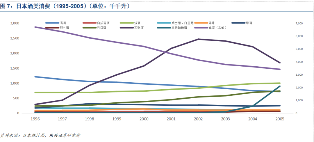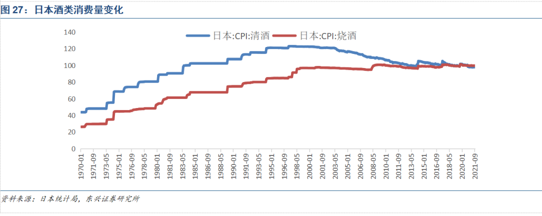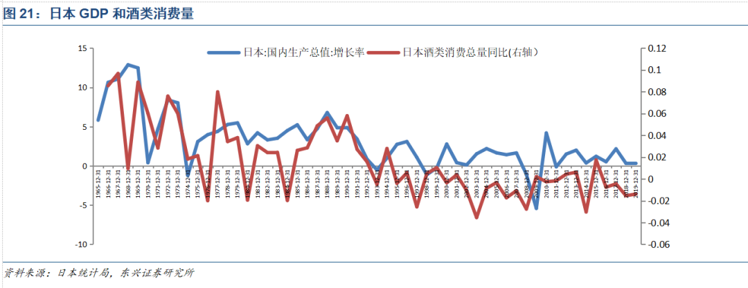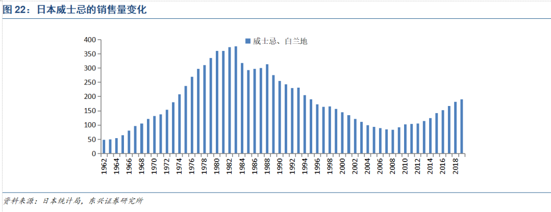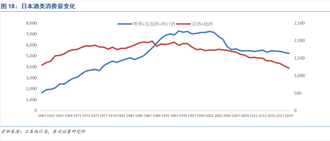 我们将清酒和烧酒的消费量作为烈酒的消费量去观察,将啤酒+发泡酒+利口酒消费量作为低度啤酒类酒水去观察,发现清酒+烧酒的消费量在1988年-1993年见顶,随后消费量下降,至2019年消费量较1998年下降了38.9%。而啤酒+发泡酒+利口酒的消费量在1992年-2001年见顶,至2019年消费量较1992年下降了28.2%。清酒+烧酒的消费量见顶在1988年,而啤酒这类新兴酒类消费量的顶部在2001年,略提前于人口数量顶部。