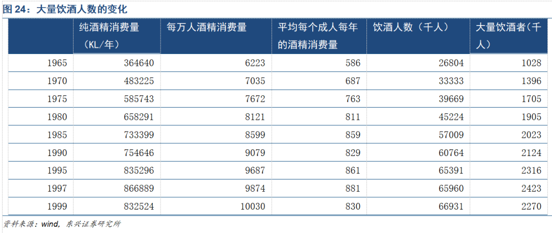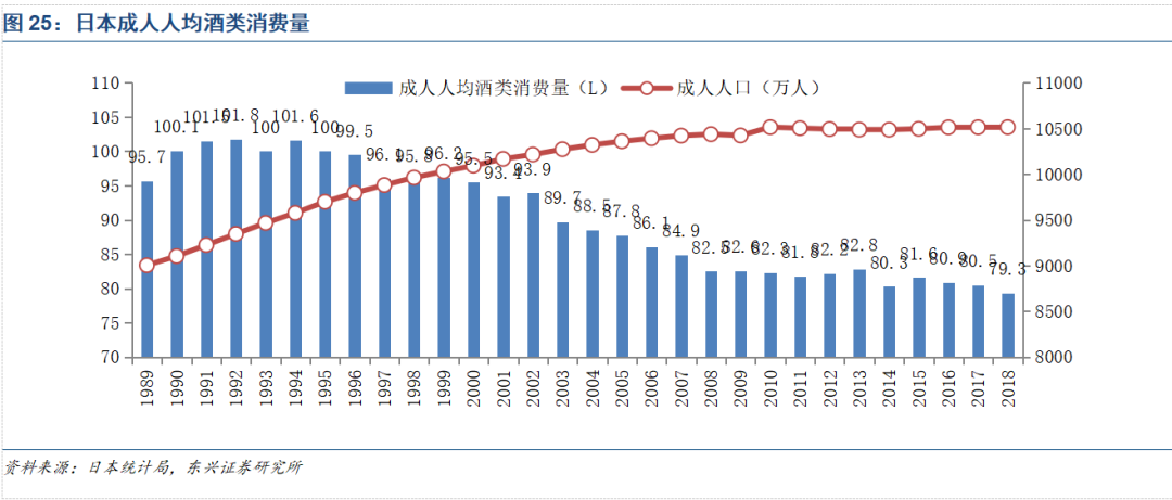1、酒类消费总量伴随着人口数量的见顶而见顶,90年代中期日本人口见顶,酒类消费量也在90年代中期见顶,与人口数量有较强的一致性。