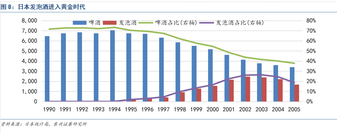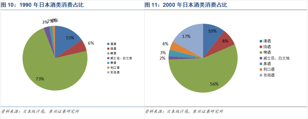 2、居民收入的变化对酒类消费有较大的影响,以白酒为例,高端酒类(清酒)的消费量在日本收入拐点出现后逐渐减少,而中低价格(烧酒)的消费量逐渐增加。而气泡酒的繁荣也是与消费者收入下降后,消费强调性价比相关。