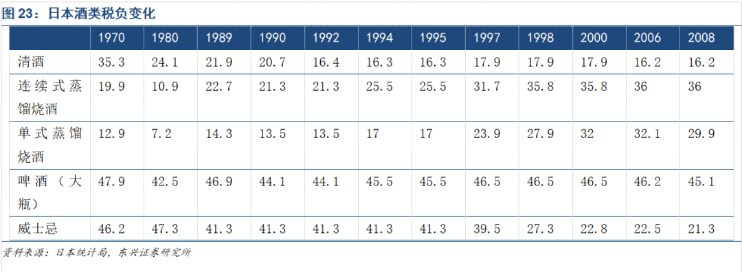 在回顾酒类消费结构变化的过程中,发现居民收入的变化对行业发展有很大的影响。以烧酒的崛起为例,我们判断烧酒之所以在80年代后期快速增长起来,与当时人们对收入预期降低、烧酒价格较低迎合大众消费有关。而在90年代后,发泡酒、利口酒这类新产品的爆发,背景也是经济衰退导致年轻人无论在社会资源还是在财富分配上受限,由于啤酒税收较高售价较高,售价相对便宜的起泡酒、利口酒被年轻人所选择。