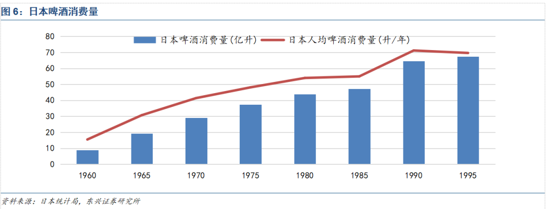 在这一时期,日本啤酒迎来大众消费的黄金阶段。二战重建后日本经济迅速恢复,国民收入快速提升,并随着电冰箱的普及,啤酒成为居家常饮的酒精饮料。在这一阶段,日本人均啤酒消费量从约15升/年增至约70升/年。70年代后,啤酒厂商也越来越注重啤酒口味的差异化,推出了生啤等高端品类,快速占领市场。