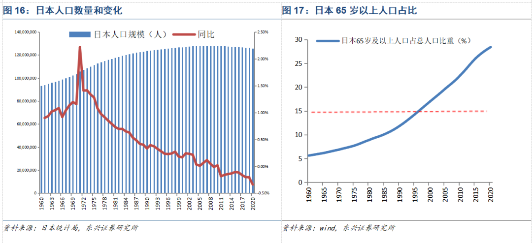 日本人口数量在90年代基本见顶,2009年以后出现总人口萎缩。1960-1976年,日本人口增速波动较大,但总体还是保持了一个相对较高的水平,1960-1975年每5年的人口快速增长,平均人口增速均在1%以上,1971年人口增速达到顶峰(2.22%),随后日本人口增速下滑。至90年代,日本人口基本见顶处于停滞增长状态,在2009年人口出现了明显的负增长,而总人口也开始萎缩,日本总人口从2008年的12808.4万人降至2018年的12644.3万人。