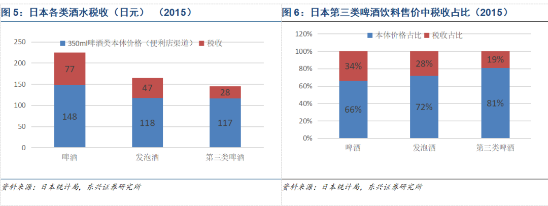 “第三类啤酒”分为两种。一种是利用豌豆、玉米等原料发酵而成的“酿造酒”;另一种是麦芽率50%以下的发泡酒与蒸馏酒混合而成的“餐后甜酒”。第三类啤酒的税率比发泡酒更低,350毫升罐装的售价为100日元左右,仅相当于啤酒的半价水平,作为“在家想喝就喝”勿需在意价格的一种饮品而稳固了它的地位,销量也远远超过了发泡酒。