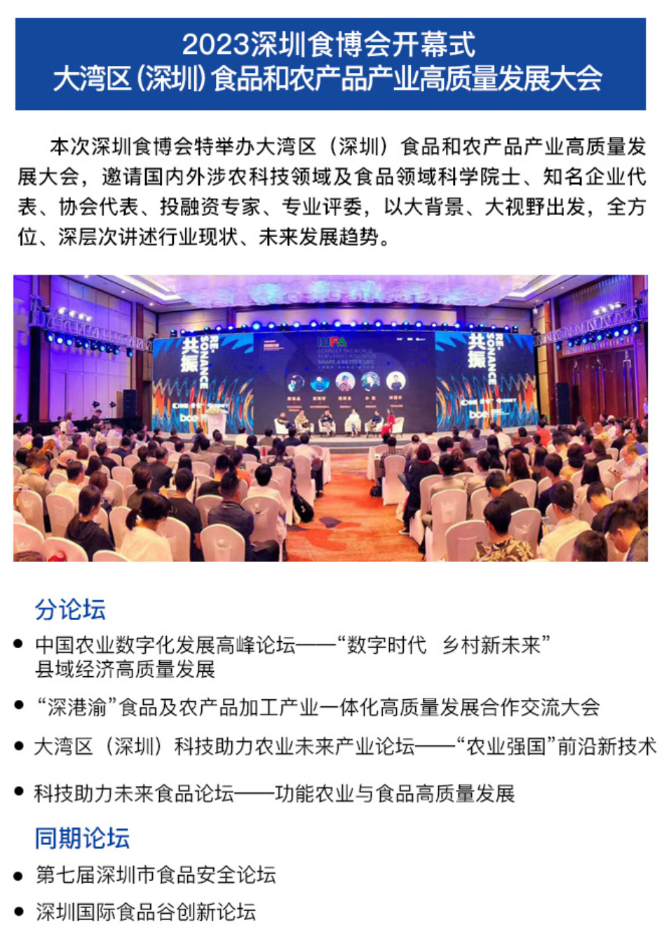 2023全球高端食品及优质农产品(深圳)博览会(简称深圳食博会)暨大湾区(深圳)现代农业和食品工业高质量发展大会是深圳市政府重点打造的食品类展会。大会将于12月1-3日在深圳(福田)会展中心举办!