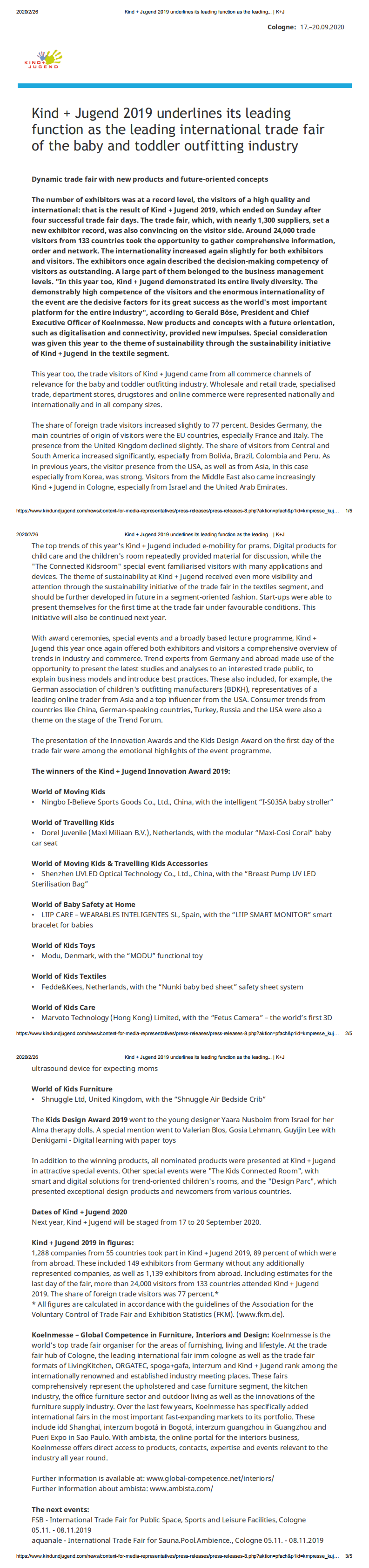Kind + Jugend展览会是一个了解全球婴童用品市场和技术发展趋势的重要机会,也是参展商和买家建立业务联系的平台。该展览会提供了一个了解最新婴童用品技术、产品和趋势的机会,同时也是婴童用品领域的专业人士和业内人士的重要交流平台。