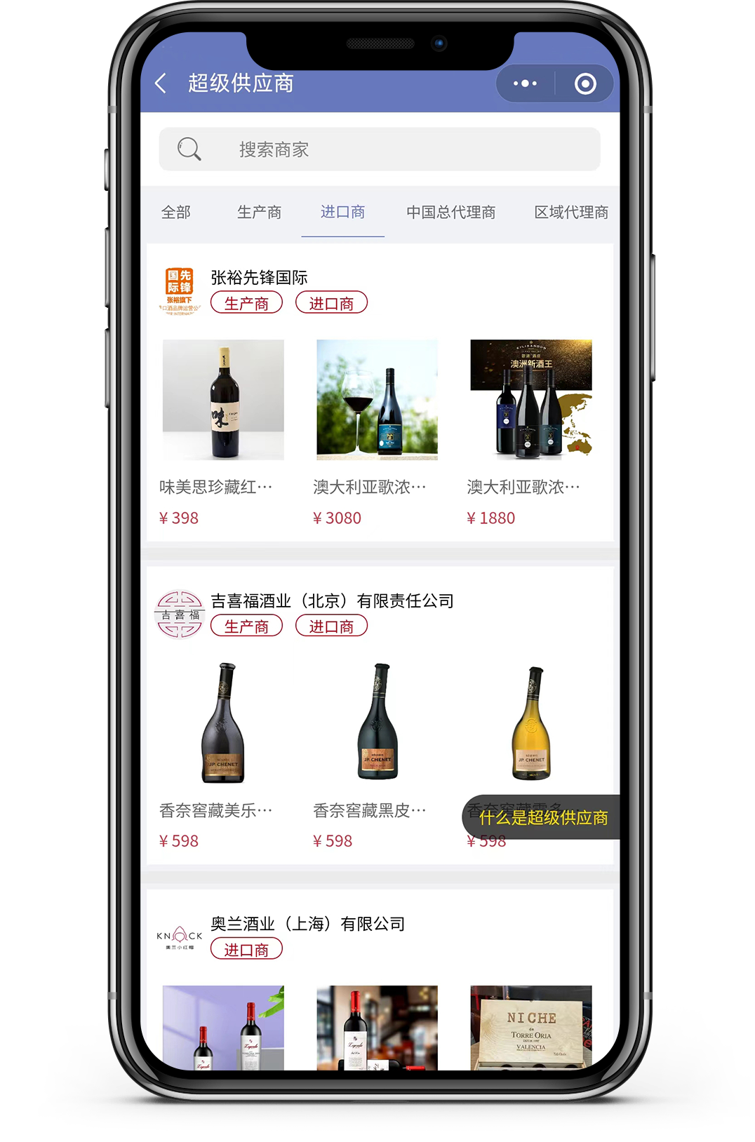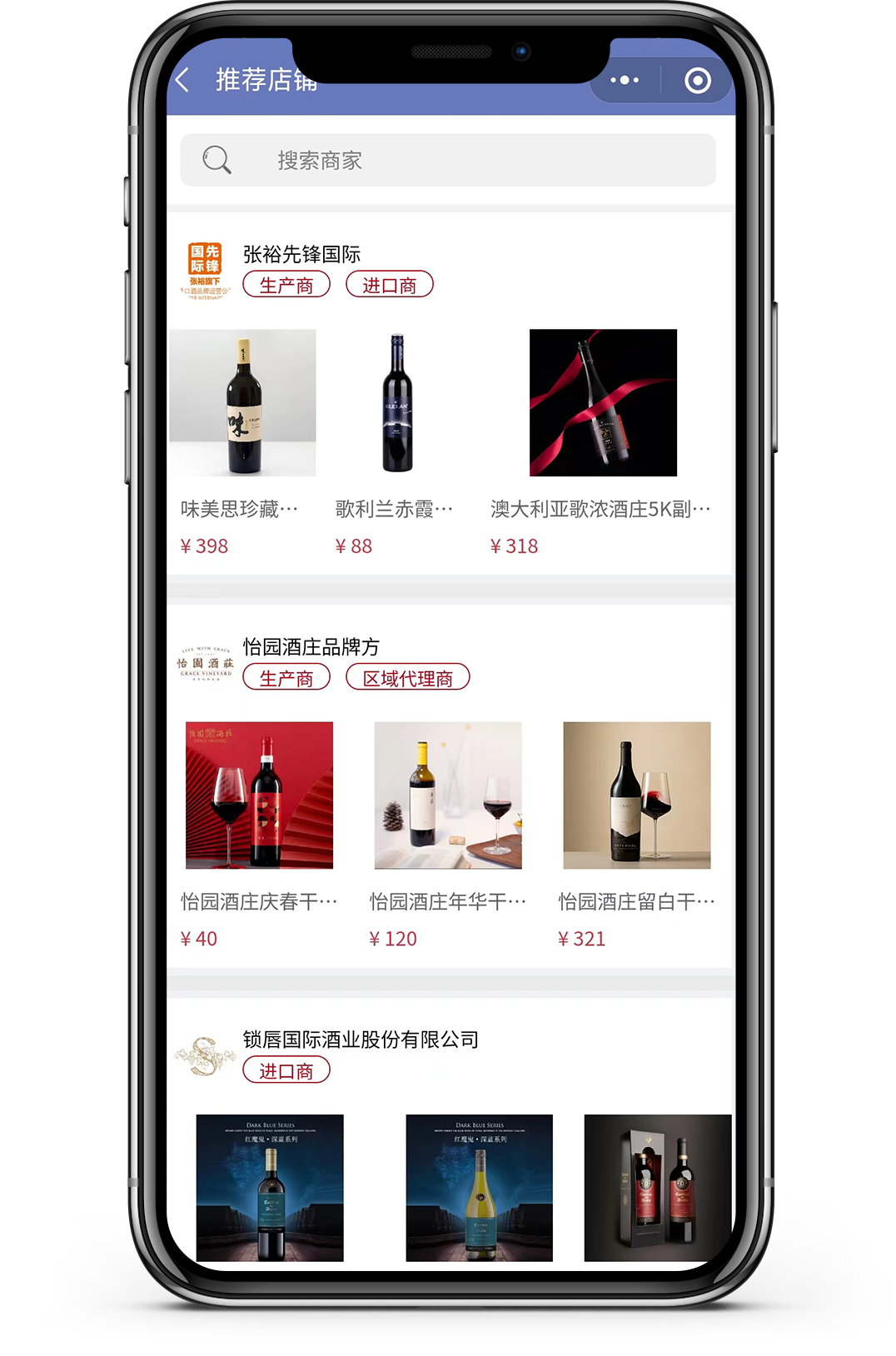 摇酒树平台与众多酒类头部品牌(张裕先锋,怡园酒庄,奥兰酒业,锁唇酒业,誉加葡萄酒集团等)合作,提高准入门槛,打造高品质葡萄酒B2B平台。