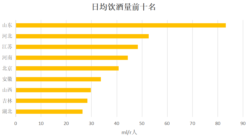山东人生性豪爽,给人的印象都是“大口吃肉,大碗喝酒”的梁山好汉。加上本身酿酒历史悠久,且非常重视餐桌礼仪和酒文化,山东人的酒量应该是毋庸置疑的。如下图全国人均日饮酒量前十名数据显示,山东人的酒量排名第一,且遥遥领先第二名。山东不但以能喝酒出名,更以酒厂多出名,几乎每个县都有自己的酒厂,素有“要当好山东的县长,先经营好当地的酒厂”的说法。