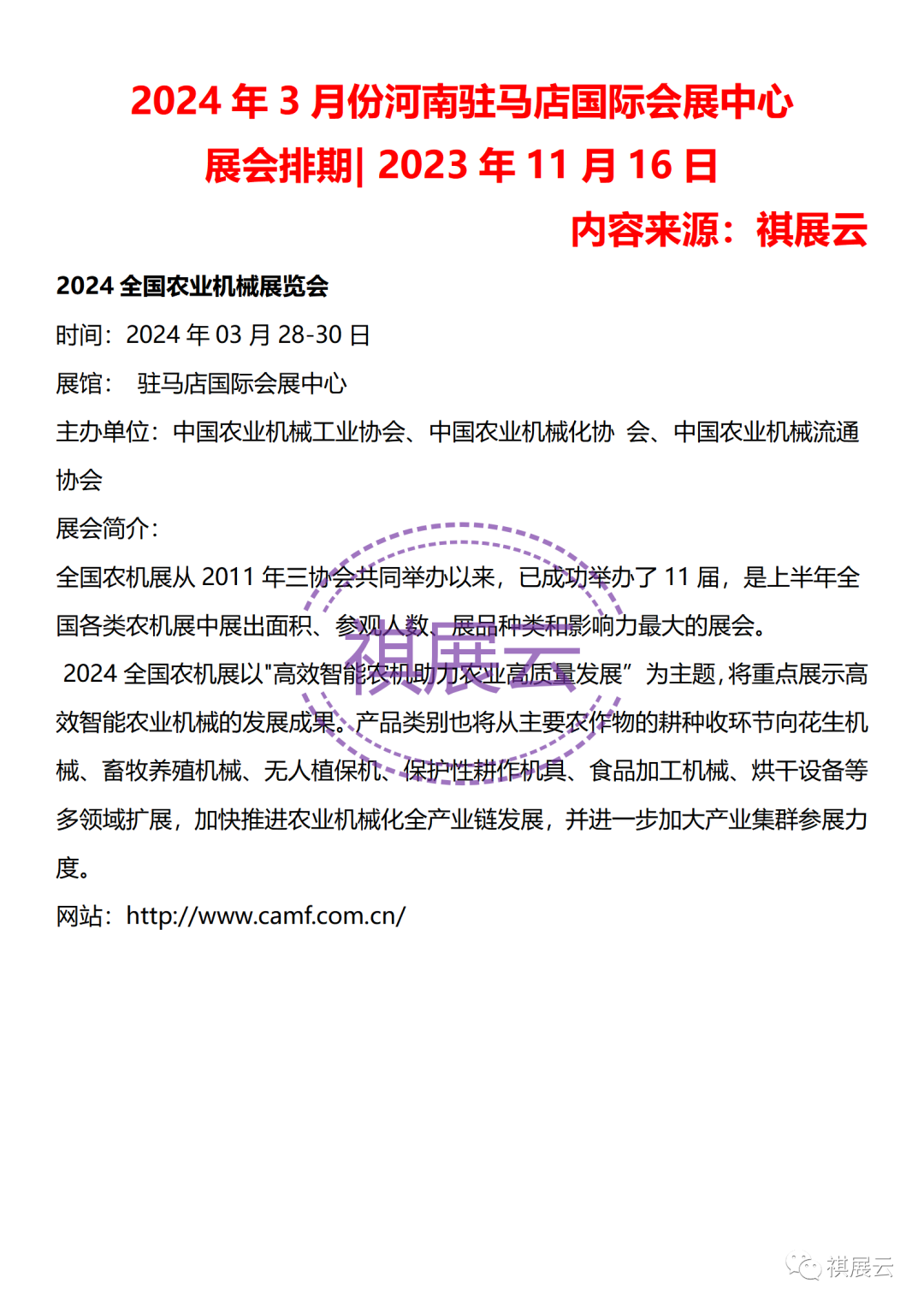 2024年3月份河南驻马店国际会展中心展会排期| 2023年11月20日