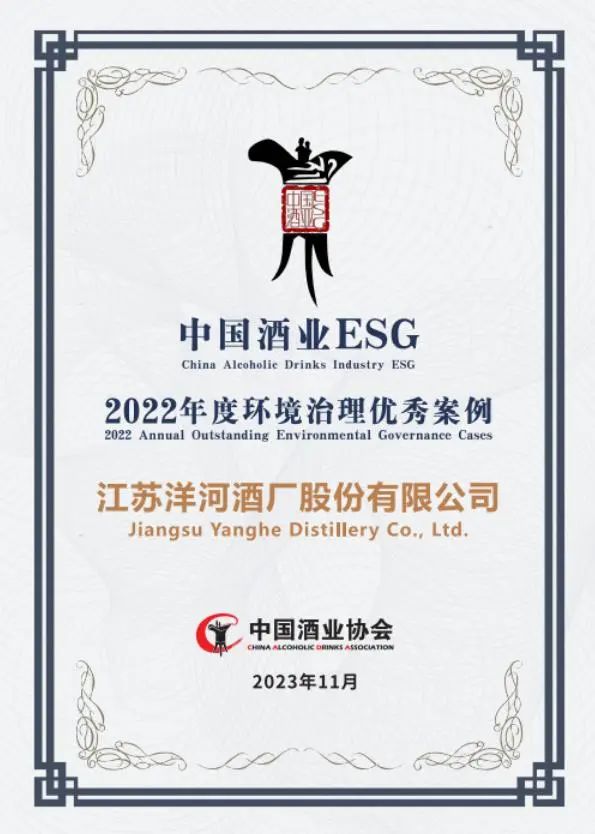 洋河股份凭借“酿造生态绵柔,引领零碳未来”的突出成果,荣获“2022年度环境治理优秀案例”。洋河股份党委书记、董事长张联东应邀出席并发表获奖感言,“ESG就是‘大生态观’、‘大生命观’和‘大生产观’,要通过ESG让中国酒业“根”更深、“枝”更壮、“叶”更茂。