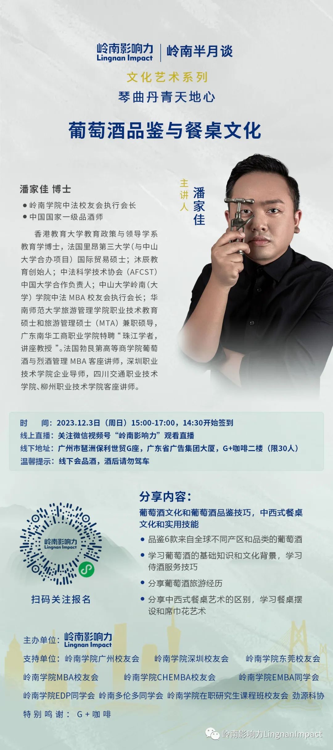 岭南半月谈 — 文化艺术系列《潘家佳:葡萄酒品鉴与餐桌文化》报名开启!