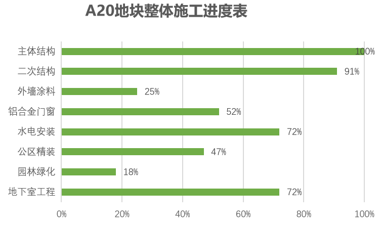 主体结构完成100%;二次结构完成91%(砌筑完成99%;抹灰完成99%;保温完成75%),铝合金门窗、栏杆完成52%;水电安装完成72%;地下室工程完成72%,公区装修完成47%,外墙涂料完成25%,园林完成18%。
