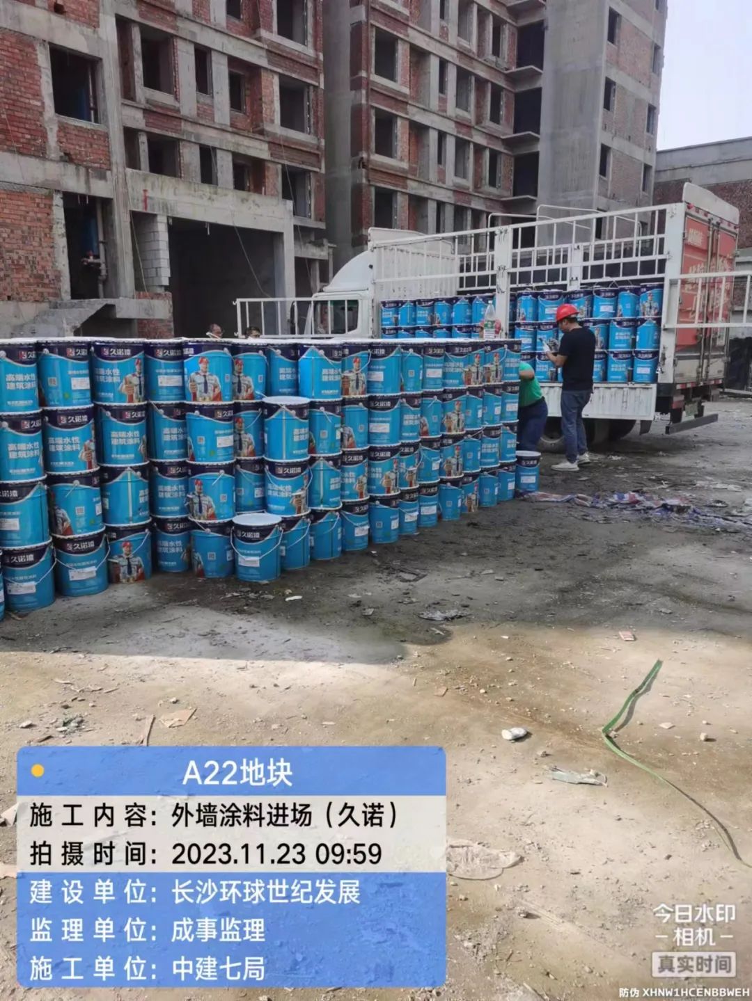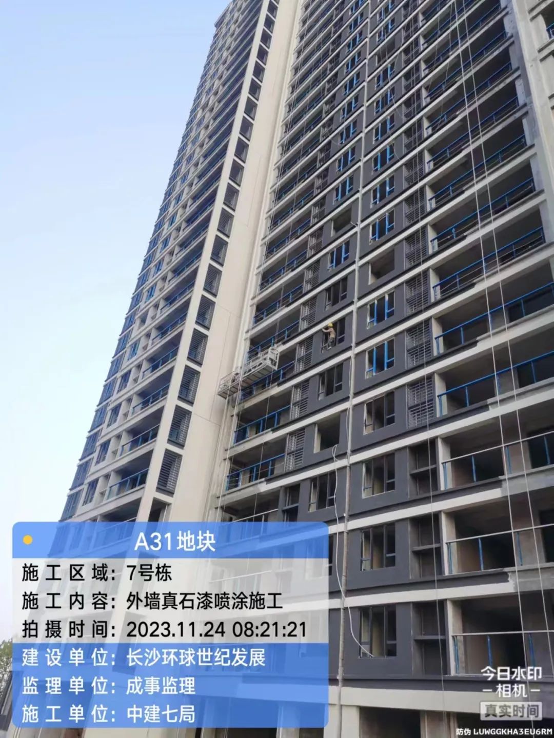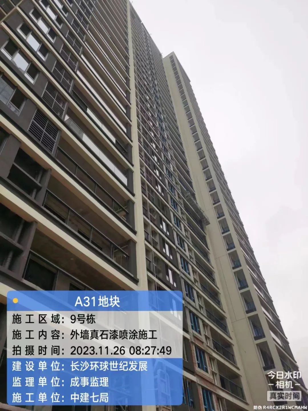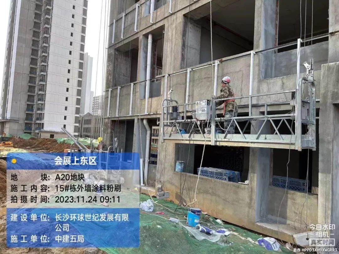 外墙涂料单位已进场,正式电梯、及园林绿化暂未具备可工作面,暂未进场。