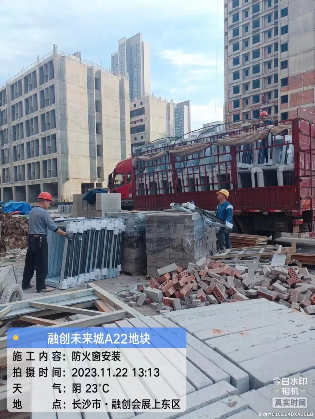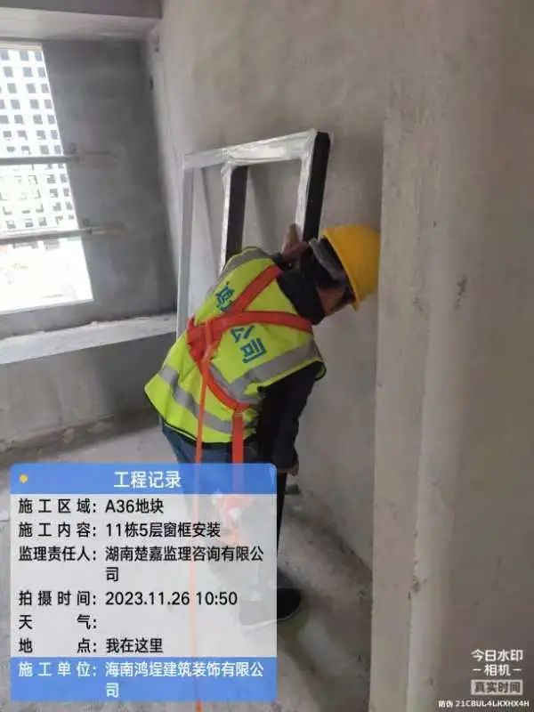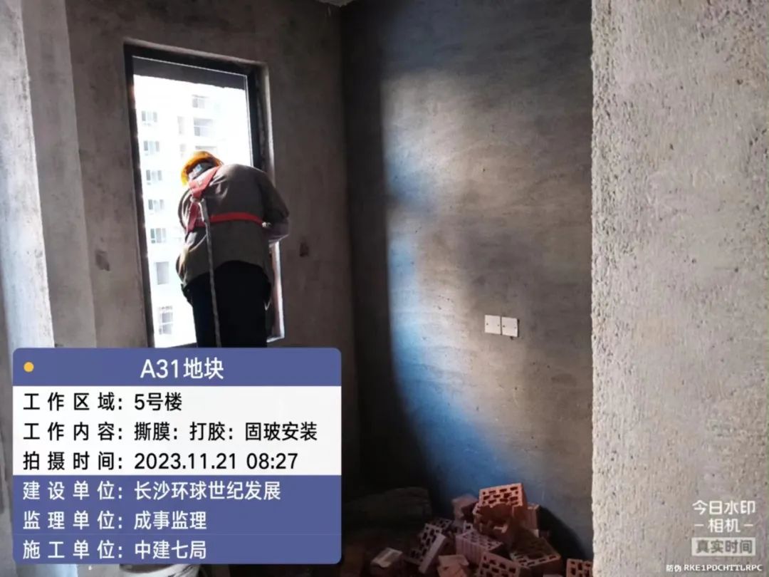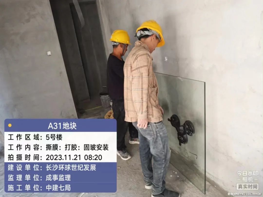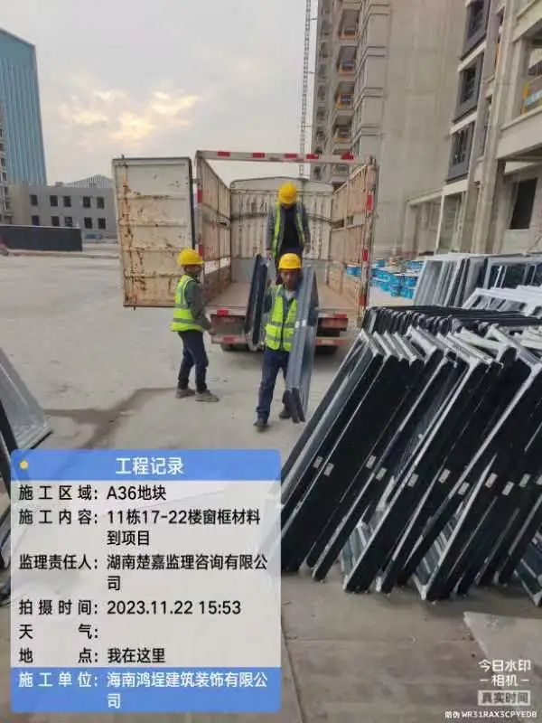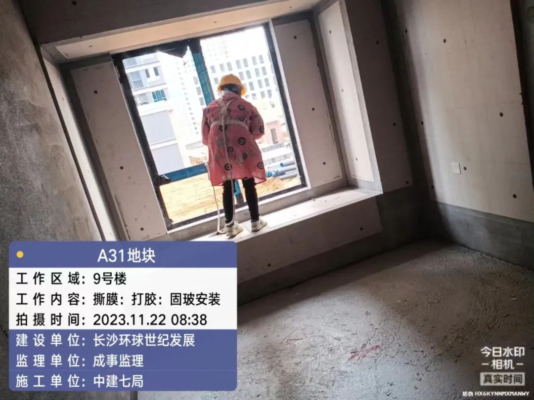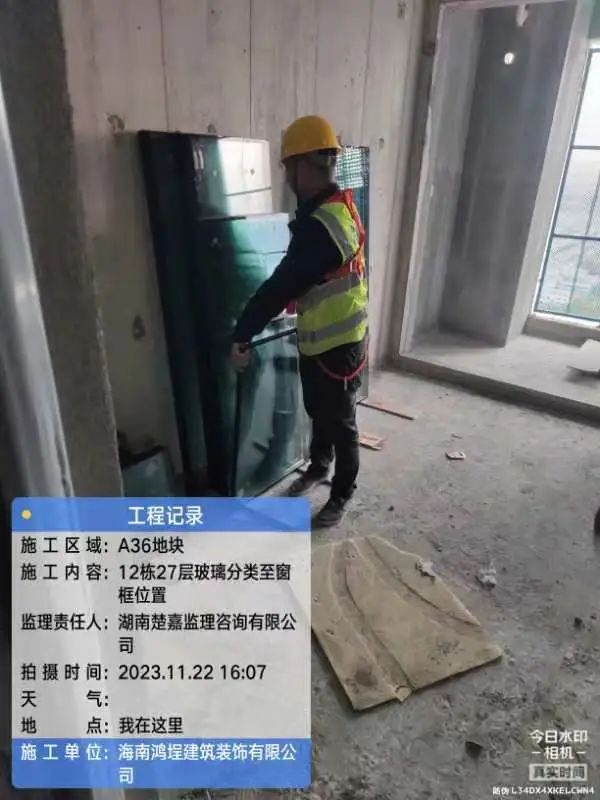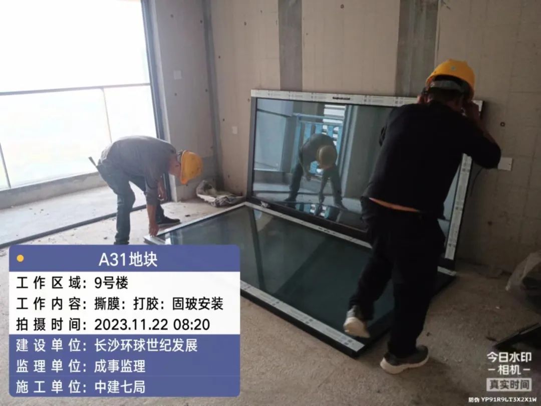 5#、7#、9#栋固定玻璃及推拉门上运材料,安装固定玻璃;防火窗、防火门扇安装。