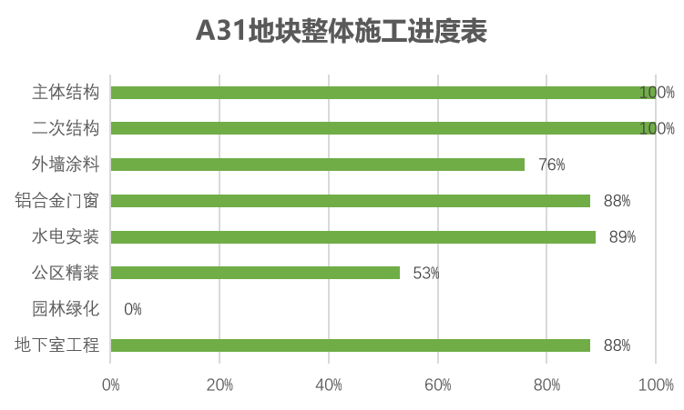 主体结构完成100%;二次结构完成100%;外墙涂料完成76%,铝合金门窗整体完成88%;水电安装完成89%;公区精装完成53%,地下室工程完成88%。