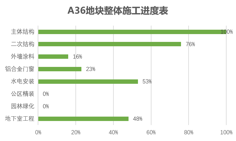 主体结构完成100%、二次结构完成87%、水电安装完成61%、地下室工程完成37%,栏杆完成12%、门窗完成49%、消防完成39%,精装完成2%。