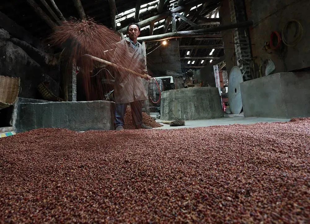 在柳林凤香酒的工艺小周期长达一年,在这个过程里,粮食需要经历九次投入,按照凤香型白酒生产工艺立窖、破窖、顶窖各1排次,圆窖6个排次进行投粮,酒醅出窖后,加入粉碎好的高粱充分拌匀润粮,上甑蒸馏前拌入稻壳,完成投粮工序。