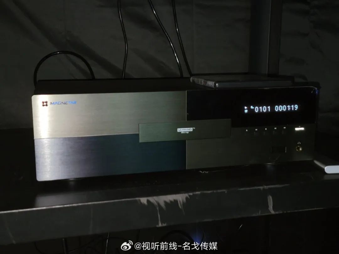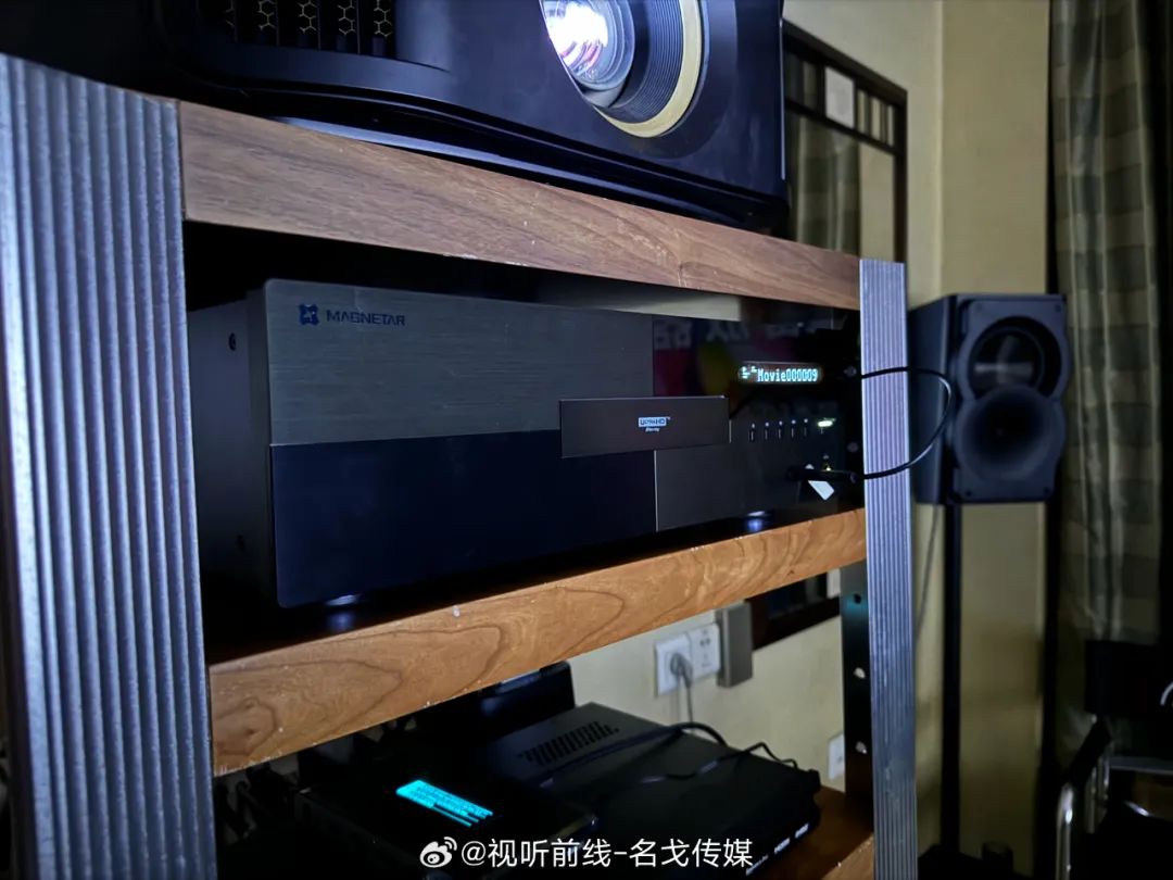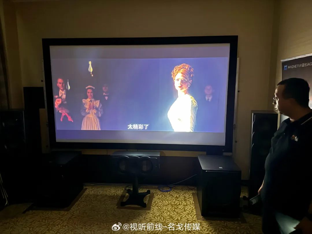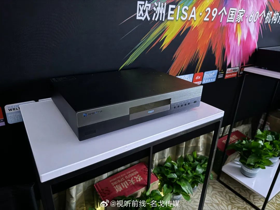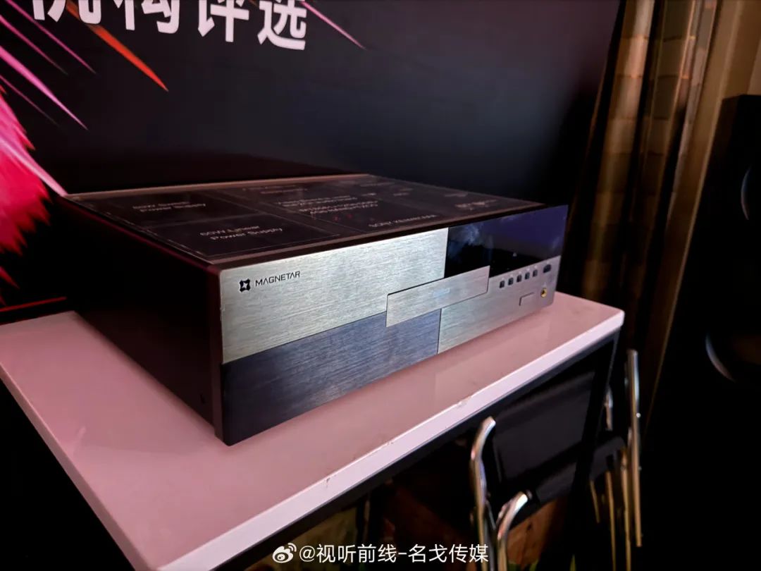 Magnetar(麦尼塔)的展房展出了UDP900、UDP800等蓝光机产品,搭配Perlisten(佰俪声)的音箱、JVC投影机进行影院示范。