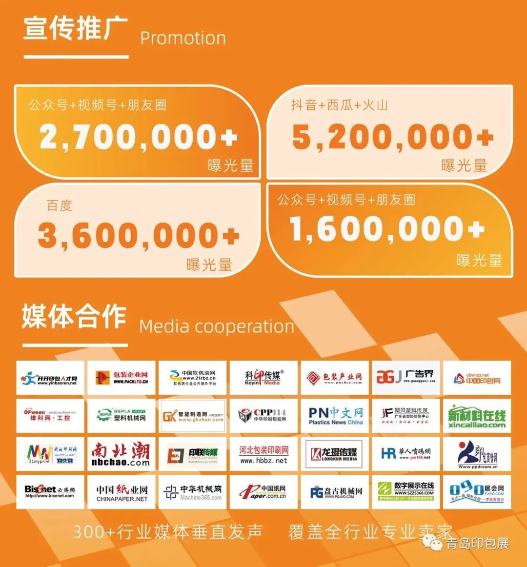 线上联合包装企业网、印科传媒、中国印包网、印刷包装产业网、印联传媒等200+家专业媒体网站及公众号,搭配百度、头条、抖音、腾讯等30+全媒体信息流渠道,打好千万量级流量曝光“组合拳”。
