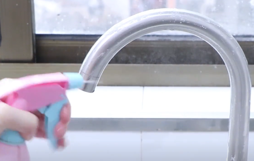 第一个用途可以去除水龙头上的油水渍哦,大家可以看到水龙头上有很多的油水渍,非常的脏。直接将香烟白酒水的溶液喷洒进去,让它静置两分钟,静置两分钟过后,直接用抹布轻轻一擦,快速去除上面的水渍水垢,效果非常不错。