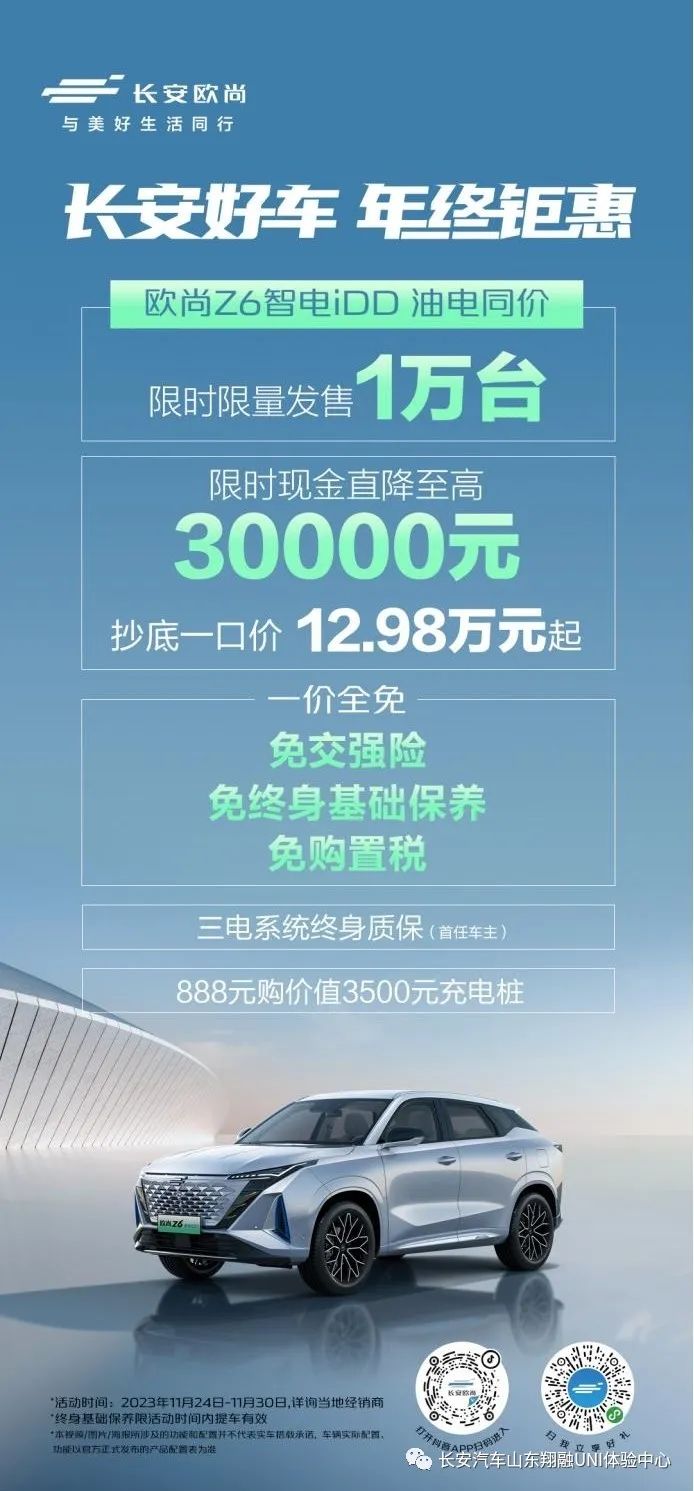 11月24日-11月30日,凡购买长安欧尚Z6智电iDD车型,即可享受三电系统终身质保(首任车主)和888元购价值3500元充电桩优惠政策,限时限量发售1万台。