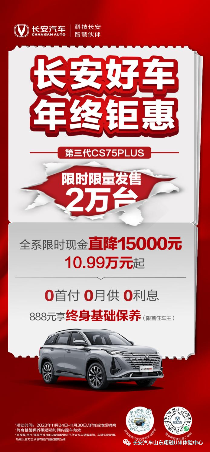11月24日-11月30日,凡购买长安第三代CS75 PLUS车型,即可享受0首付 0月供 0利息和888元享终身免费基础保养优惠政策,限时限量发售2万台。