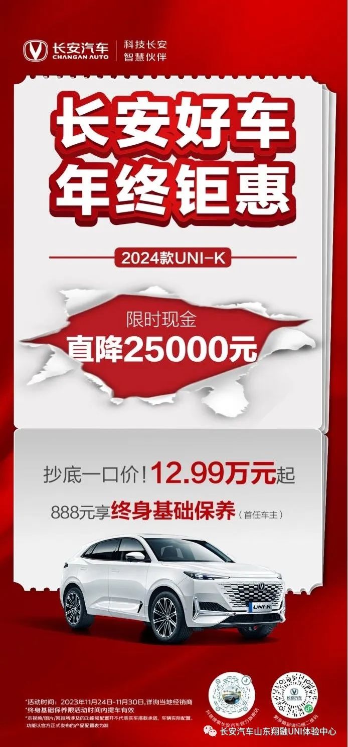 活动期间,凡购买2024款 UNI-K车型,即可享受限时现金直降25000元;888元享终身免费基础保养优惠政策