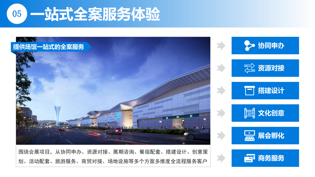 多方面多维度全流程提供场馆一站式的全案服务,满足各类办展办会主体需求,为与会嘉宾打造一站式的良好参会体验。
