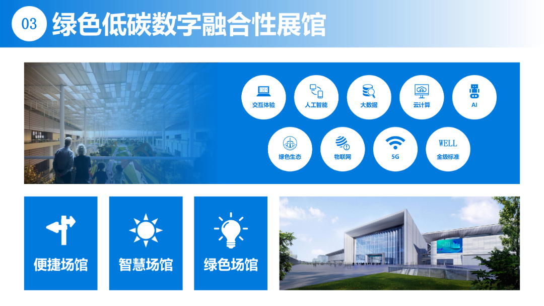 场馆结合地铁换乘站、滨江景观带,运用 5G、物联网、AI等新一代前沿信息技术,打造世界级的绿色、循环、生态会展示范样板。