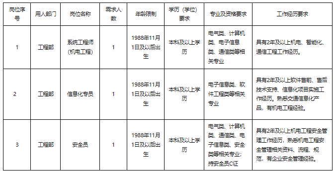 台州交投数智科技发展有限公司于2022年1月组建成立,注册资本金伍仟万元整,为台州市交通投资集团有限公司下属子公司,公司主营业务有机电工程安装和维护,智能化设计与施工以及信息系统集成服务等。因公司经营管理需要,现面向社会公开招聘市场化工作人员。台州市交投集团网站:http://www.tzjtjt.com/台州市人才网:https://www.tzrc.cn/智联招聘网:https://www.zhaopin.com/1、报名方式:符合岗位招聘条件者,请以“岗位-姓名”命名文件夹,将《公开招聘人员报名表》(附件1)、身份证、学历学位证书、资格证书、职称证书、荣誉证书、工作经历证明相关材料电子版,以“文件压缩包”形式发送至应聘邮箱:tzjtszkj@163.com。招聘要求涉及到的工作年限,计算时间截止到2023年11月1日,出生日期以身份证为准。在全日制高校就读期间参加的社会实践、实习、兼职等不视为工作经历。2、报名截止时间:2023年12月10日17:00。联系人:黄女士,联系方式:0576-81876696(工作日)。3、资格审查:招聘单位将对报名人员进行资格审查,经资格初审合格的人员,将会收到相应的电话或短信通知,并发送考试通知包含考试时间及地点,未通过资格审查者不另行通知。4、考试方式:采用半结构化面试,主要考察应聘人员的综合能力和岗位匹配度,成绩满分为100分,合格分为70分。面试名单将在台州市交通投资集团有限公司网站公布。5、录用:面试结束后,依成绩从高到低顺序,按招聘岗位1:1的比例确定入围体检和考察对象。经体检、考察合格的人员,确定为拟聘用人员,在台州市交投集团网站公示。公示期满后,无反映问题或反映问题经查实不影响聘用的,按规定程序办理聘用手续。对反映有影响聘用问题并查有实据的,不予聘用;对反映的问题一时难以查实的,暂缓聘用,待查清后再决定是否聘用。(一)在面试、体检、考察、公示等环节,如发现不符合要求,或因报考人员自身原因放弃,或在规定时间内不按时到岗等,取消聘用资格。因取消聘用资格而产生的空缺名额,由公司根据实际情况研究决定是否在相应岗位面试合格人员中按考试成绩从高分到低分进行递补。(二)应聘人员对招聘公告本身或在指定网站公布的相关信息有异议的,可在公布之日后向我公司综合部反映,以便及时纠正。(三)公司有权根据报名情况,调整部分岗位的招聘计划,并在法律允许的范围内对整个招聘活动享有最终解释权。