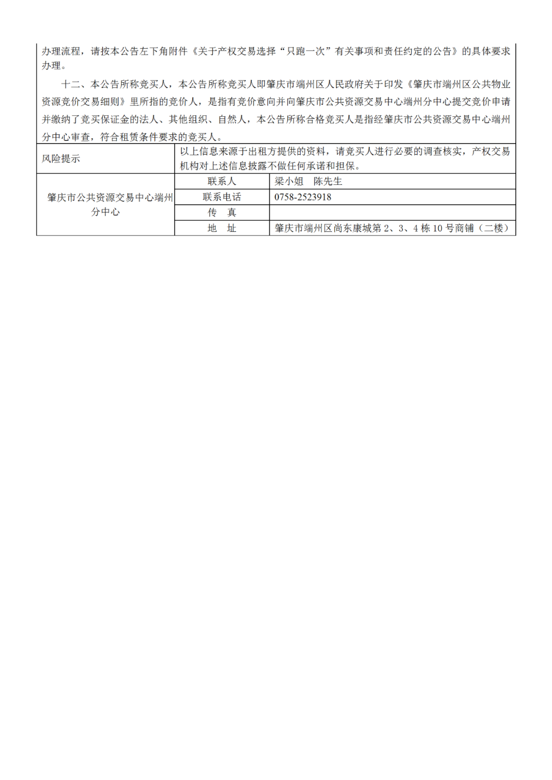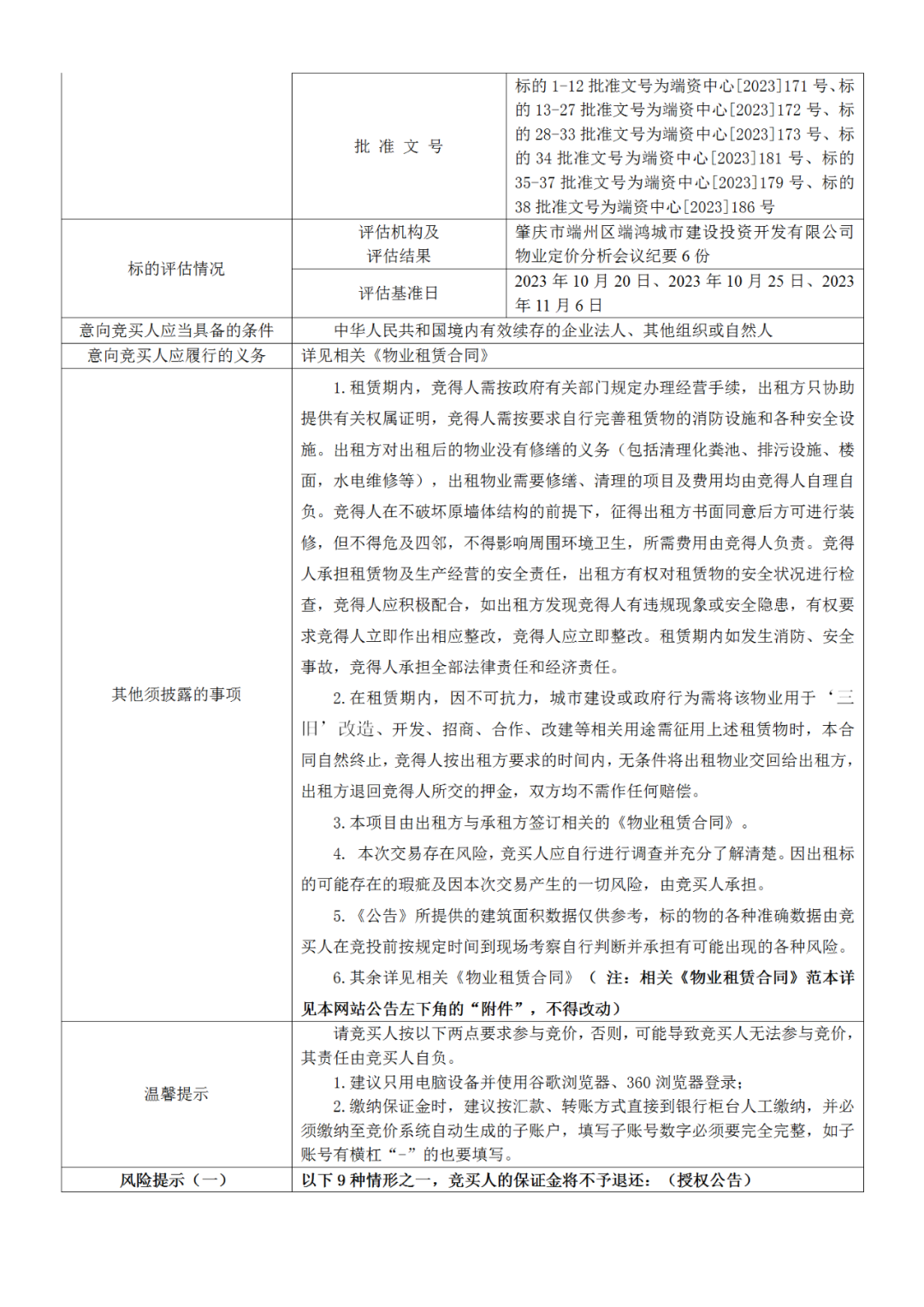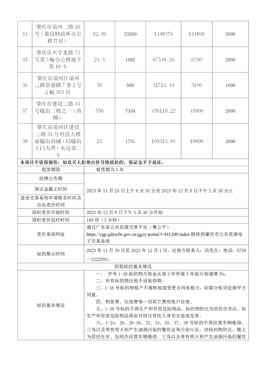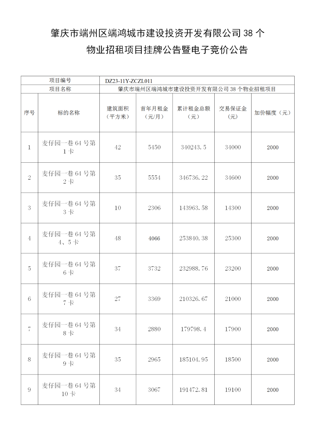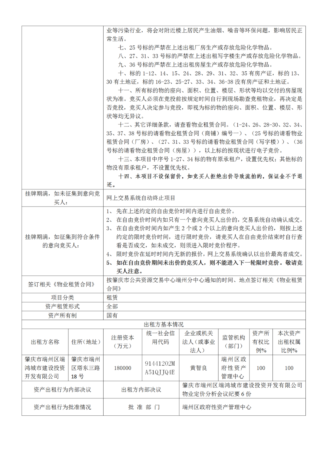 肇庆市端州区端鸿城市建设投资开发有限公司38个物业招租项目挂牌公告暨电子竞价公告
