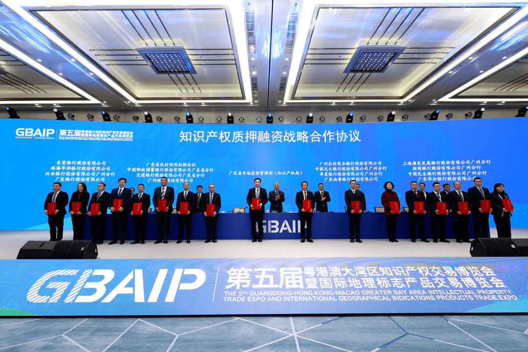 开幕式上,广东省市场监督管理局(知识产权局)与广发银行股份有限公司、广州银行股份有限公司、东莞银行股份有限公司、广东南粤银行股份有限公司、广东华兴银行股份有限公司、珠海华润银行股份有限公司等16家银行举行了知识产权质押融资战略合作协议,此外,广东省知识产权保护中心与广东粤财投资控股有限公司,中新广州知识城管委会与中国汽车技术研究中心有限公司,广州商标审查协作中心与广东省个体劳动者私营企业协会、广东新方略质量科学研究院等有关机构举行了“粤知保-粤财信-长江楚越‘1-50期知识产权资产支持证券’知识产权证券化产品储架”“共建中国汽车知识产权运用促进中心合作协议”“商标品牌服务建设战略合作框架协议”等重大知识产权项目签约仪式,以上举措将有效帮助中小微企业缓解融资困难,促进科研院所知识产权向中小微企业转移转化。第五届知交会暨地博会由广东省市场监督管理局(知识产权局)、广州市人民政府、香港特别行政区政府知识产权署、澳门特别行政区政府经济及科技发展局共同举办。大会以“贯彻强国建设纲要,推进构建新发展格局”为主题,全面突出知识产权交易特色,丰富地理标志产品交易活动,加快推动知识产权价值实现,助力粤港澳大湾区建设,加强知识产权保护和运用,搭建知识产权国际合作平台。开幕式之后,第五届知交会暨地博会的知识产权“交易博览、湾区论坛、专场活动”三大板块内容将于1月9日至11日线上举行。交易博览全新打造“2馆8区”,力促知识产权成果高效流转;知识产权湾区论坛以“1场主论坛+8场分论坛”模式汇聚高端智慧,共同探讨知识产权热点问题;13场特色鲜明的知识产权专场活动集中呈现湾区知识产权蓬勃活力。本届知交会暨地博会亮点纷呈,多项创举加速知识产权价值实现。首次加挂国际地理标志产品交易博览会,推动地理标志兴农与乡村振兴战略有机融合,力争搭建立足湾区辐射全球的地理标志“贸易港”;首设中国专利金奖成果展区,打造重要创新成果展示窗口;更加突出知识产权交易转化平台功能,4100家参展机构、1.4万余件知识产权展品云端竞相亮相,知识产权拍卖、地理标志推介专场活动共同发力,打通知识产权转化交易渠道。在接下来的三天时间里,有专利、商标、地理标志、版权等交易需求的市场主体,可通过在线参展观展、合作洽谈,共议知识产权热点,广泛开展知识产权运营转化和地理标志产品交易活动,充分对接知识产权供需两端,汇聚创新资源落地转化,全面推动“知交会+互联网”立体发展。国家知识产权局副局长卢鹏起、世界知识产权组织中国办事处主任刘华、香港特别行政区政府知识产权署署长黄福来、澳门特别行政区政府经济及科技发展局副局长陈子慧在开幕式上视频致辞。广东省人民政府副秘书长任小铁,国家知识产权局知识产权运用促进司副司长彭文,广东省市场监督管理局(知识产权局)党组书记、局长刘光明,广州市人民政府副市长赖志鸿,国家知识产权局专利局专利审查协作广东中心主任董琤等领导出席开幕式。开幕式由广东省市场监督管理局(知识产权局)党组副书记、广东省知识产权保护中心主任马宪民主持。与会领导为获得第二十三届中国专利奖嘉奖、第九届广东专利金奖和第九届广东杰出发明人奖的获奖代表颁奖。