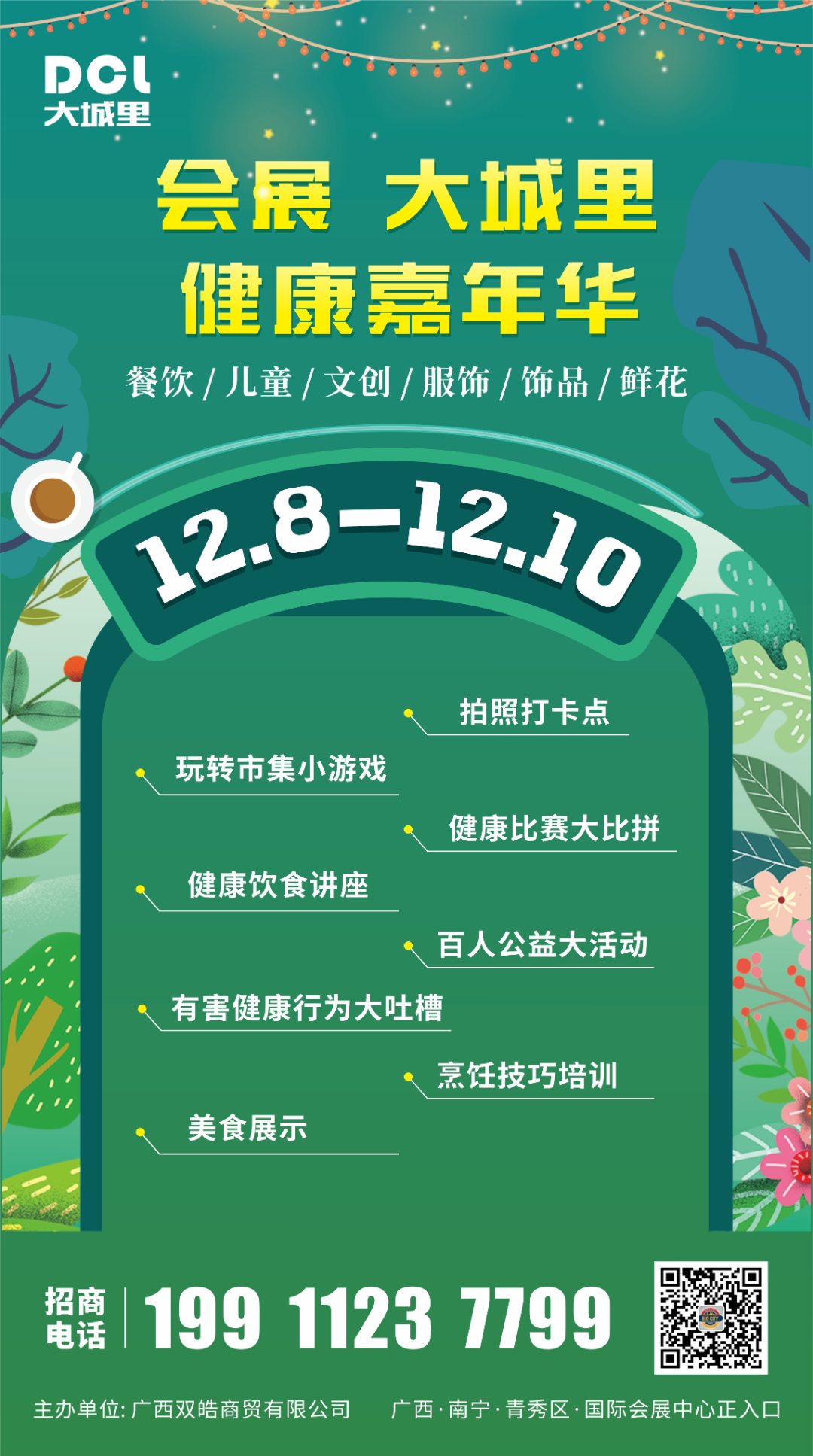 会展·大城里健康嘉年华美食集市是2023中国—东盟大健康产业博览会的系列活动之一,将于2023年12月8日在南宁举办。