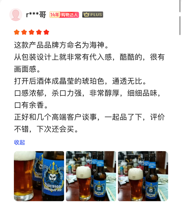 “打开后酒体成晶莹的琥珀色,通透无比。口感浓郁,杀口力强,非常醇厚,细细品味,口有余香。正好和几个高端客户谈事,一起品了下,评价不错,下次还会买。” “不仅口感,包装设计上也非常有代入感,酷酷的,还有大航海时代的神秘感。”“口感醇厚、麦芽浓、品质高、价格:值!!!”在刚刚过去的双十一,收到青岛啤酒IPA的消费者纷纷打出五星好评。