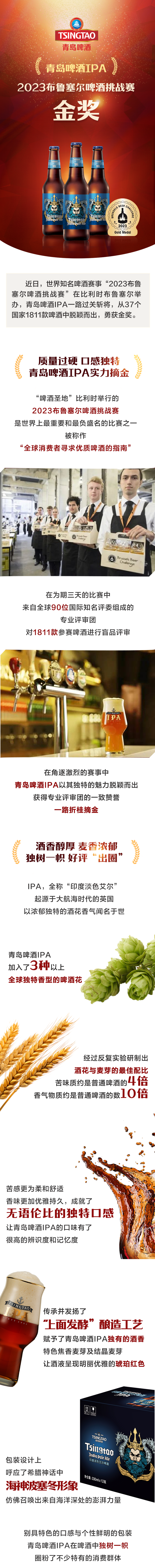 早在1906年,建厂仅三年的青岛啤酒就在慕尼黑国际博览会上荣获金奖,这是中国啤酒行业获得的第一项国际大奖。此后的百年间,青岛啤酒屡获国际国内质量评比金奖,两度荣获中国质量奖提名奖、华盛顿国际品酒会冠军、蒙顿国际评比大赛金质奖,两次在啤酒的故乡德国摘得“欧洲啤酒之星”,多次在“世界啤酒锦标赛”摘金夺银。