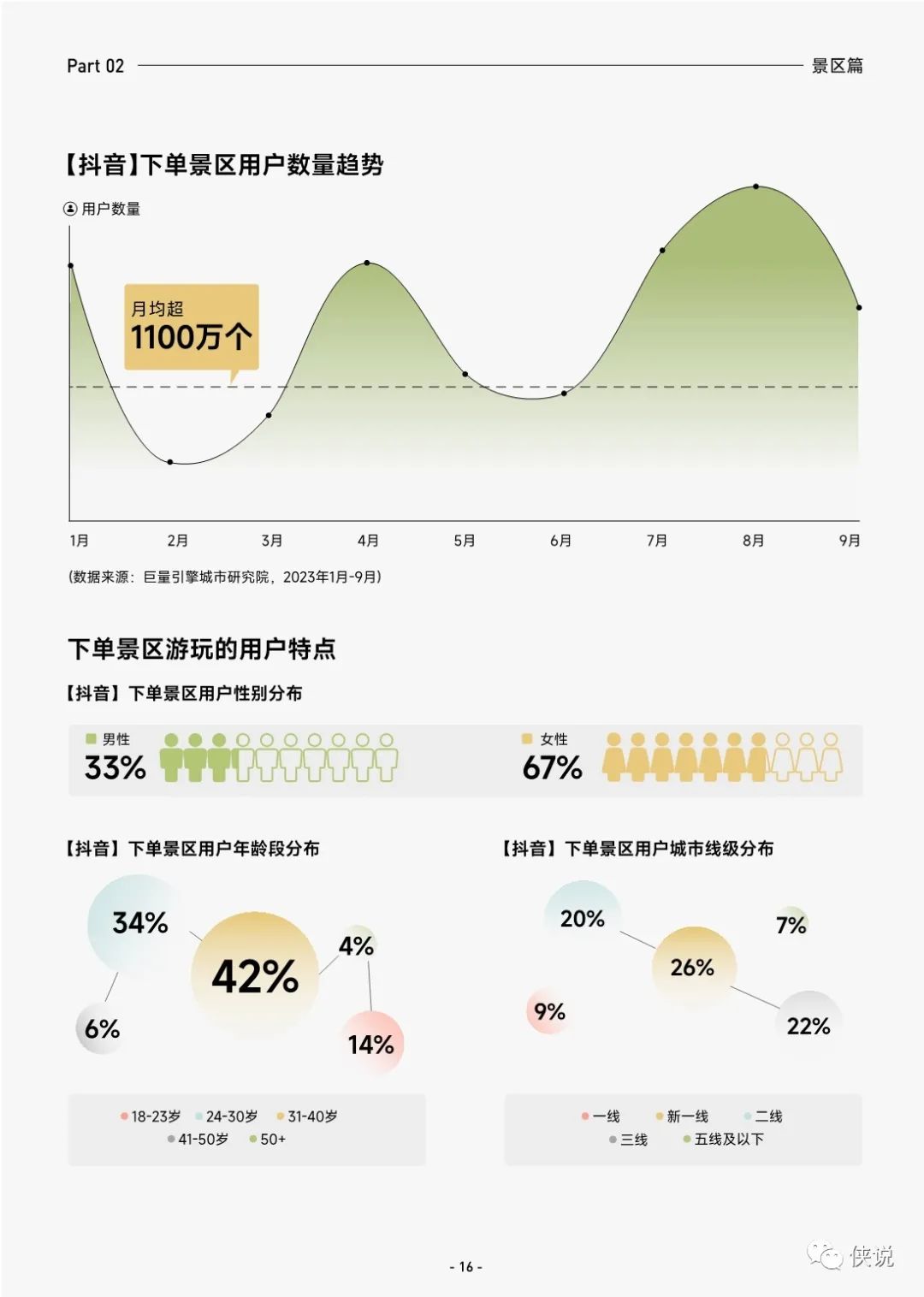 2023年1月-9月,月均4.7万旅行达人在抖音发布旅行相关内容,今年9月对比1月,旅行达人数量增长31%旅行达人类型丰富多样,2023年9月,旅行风景类达人数量超过2.5万人,在抖音平台发布旅途风光,从增速上来看,今年9月对比1月,旅行攻略类达人增长超1倍,随着交通基础设施的完善以及信息获取更加透明便捷,选择自驾自助出行的人越来越多,许多人在抖音观看旅行攻略,开启旅行。