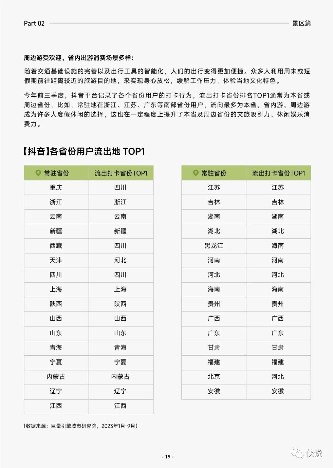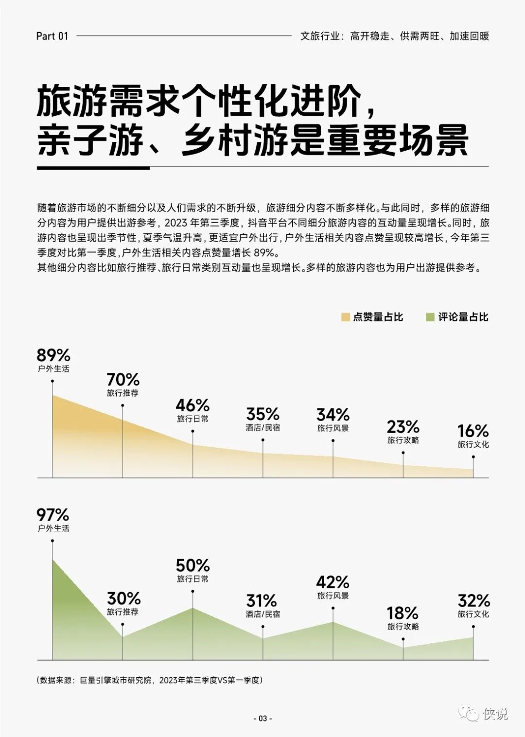 随着旅游市场的不断细分以及人们需求的不断升级,旅游细分内容不断多样化。与此同时,多样的旅游细分内容为用户提供出游参考,2023 年第三季度,抖音平台不同细分旅游内容的互动量呈现增长。同时,旅游内容也呈现出季节性,夏季气温升高,更适宜户外出行,户外生活相关内容点赞呈现较高增长,今年第三季度对比第一季度,户外生活相关内容点赞量增长 89%。