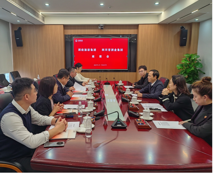 在川酒集团,陈华军一行同川酒集团党委委员、工会主席艾远彬开展交流。会上,艾远彬从川酒集团“做强做实四川白酒产业的底部基础和腰部力量”的战略定位出发,介绍了川酒集团的发展历程及相关未来规划。陈华军表示了对川酒集团发展思路及成就的高度认可,希望可以从酒类业务出发,以金融投资、人才培训、双方交流互鉴等角度与川酒集团展开全方位的深入交流与合作,汲取川酒集团的经验,加快推动湖南旅游集团旅游商贸板块快速发展。