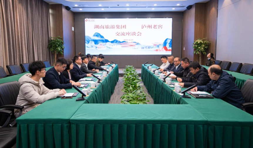 在泸州老窖,陈华军一行实地考察了1573国宝窖池,并与泸州老窖股份公司副总经理、董事会秘书李勇开展交流。会上,李勇对陈华军一行的到来表示欢迎,会上介绍了泸州老窖的发展情况,并对泸州老窖定制酒、一城一品、新酒业公司等业务板块展开了详细说明。陈华军提出,泸州老窖是中国四大名酒之一,有着深厚的历史底蕴与强大的企业价值,湖南旅游集团期望与泸州老窖从主业产品到酒旅融合开展深度探讨,发挥各自资源禀赋、市场运营优势,拓展合作空间,促进协同发展,实现互利共赢。