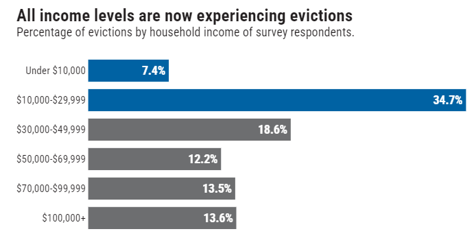 数据显示,2021年被驱逐者中有近三分之一的年收入达到或超过7万元(2022年几乎四分之一的受访者都是如此),而 2023 年迄今为止被驱逐者的这一比例跃升至40%。