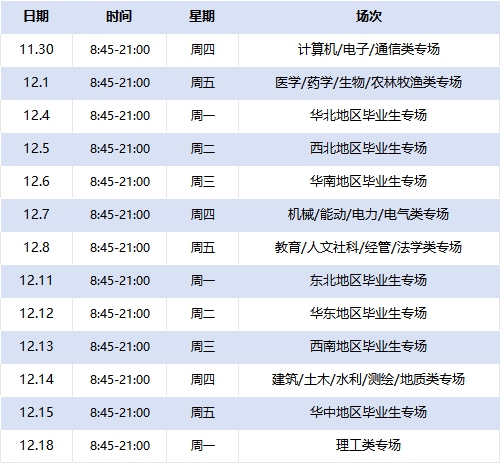 1、线上学科专场面试会当日举办时间为8:45-21:00,其中9:00-11:00为集中面试时间,建议大家11点前上线参会,具体举办日期如下: