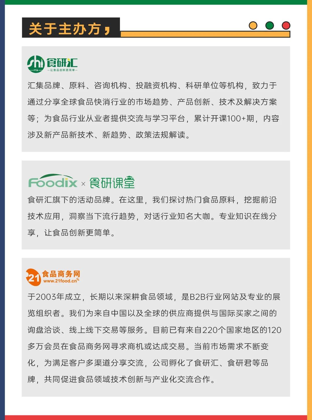 齐聚食品全产业链,瞄准食品新方向,为食品企业提供优质的展示交流平台,为参会嘉宾带来面对面新品体验。更有食研汇精准买家团,将有效促进深度合作,助力行业发展。来源丨食研汇FTA