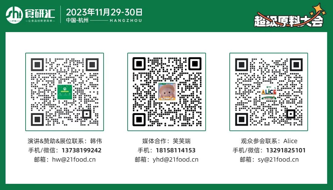 2023食研汇超级原料大会将于2023年11月29-30日在杭州举行,深度围绕“让食品创新更简单”这一主题,发挥食研汇品牌优势,深挖“超级原料”,探索“热门原料”,聚集全球食品与饮料行业专家、知名企业、高校学者、创新品牌,将前沿深度与顶层格调相结合,开拓食品新视野,打造颇具重磅影响力的食品行业盛会! PS:联系协会秘书处工作人员获取邀请码,即可免费参会哦~