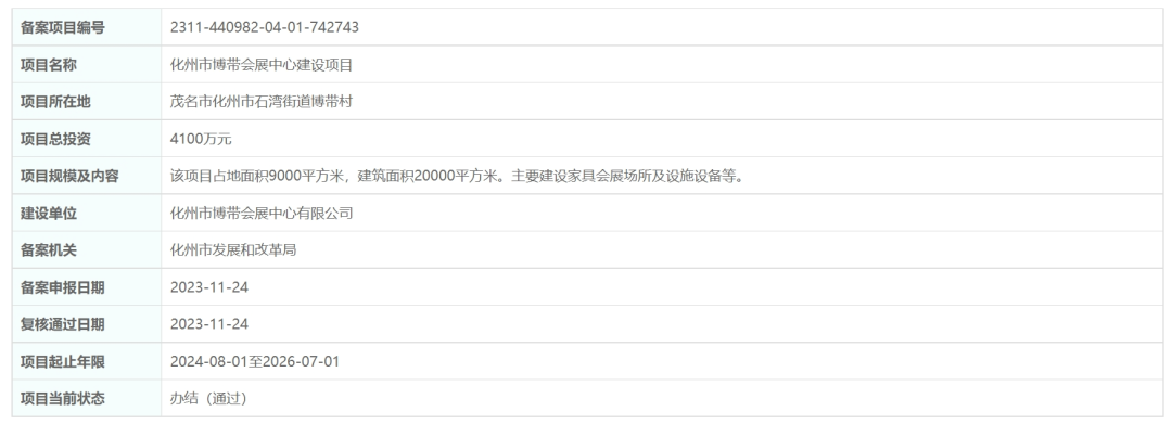 日前,政府投资审核中心公示通过了化州市博带会展中心建设项目立项。该项目总投资4100万元,占地面积9000平方米,建筑面积20000平方米,主要建设家具会展场所及设施设备等。