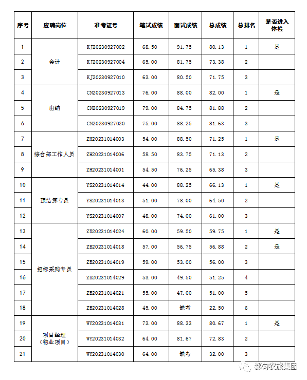 根据《都匀市农旅产业发展集团有限公司公开招聘方案》的有关要求,我公司已完成会计、出纳、综合部工作人员、预结算专员、招标采购专员和项目经理(物业项目)等岗位的面试工作,现将总成绩和进入体检人员名单予以公示。