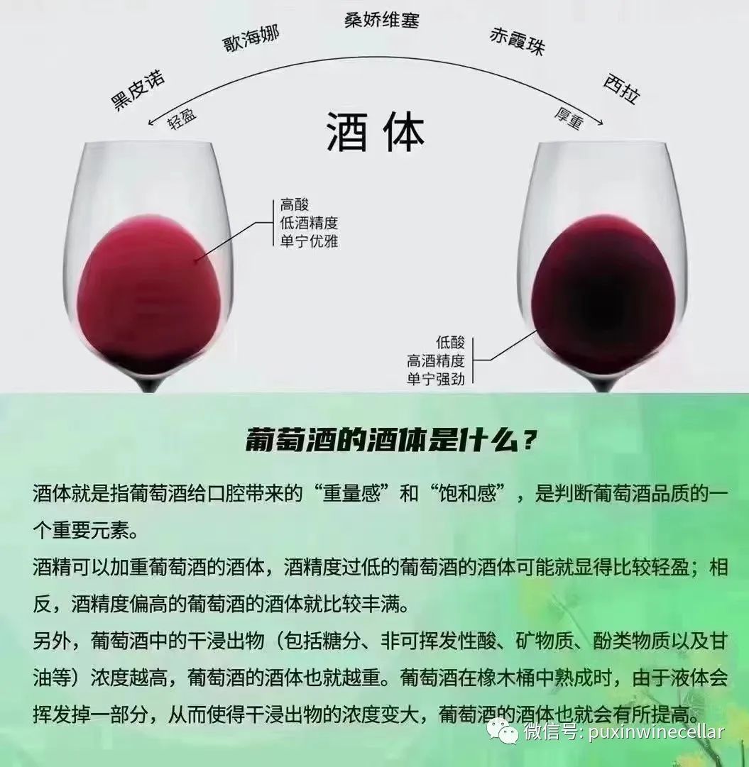 酒体:简单的说就是葡萄酒在口中的“质量”和“重量”它专指酒液在舌头面上的质量,也是葡萄酒中的单宁、糖分、酸度、甘油和干浸出物等结合起来口中的分量......