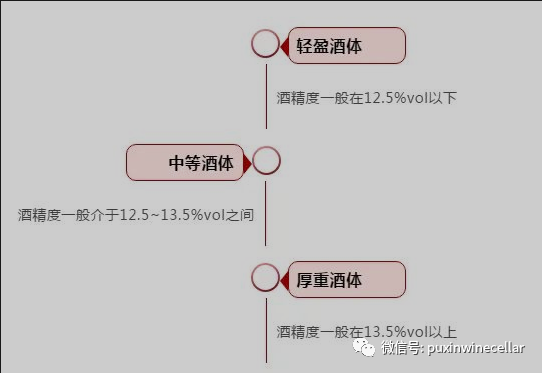 1:酒精度:酒精度是影响酒体的最为关键的成分,酒精比水的粘度更高,给人体带来的质感也比水更重,因此酒精度越高,口感也越重,酒体也会越饱满,葡萄酒一般情况下酒精度高于13.5%的葡萄酒属于酒体饱满型。
